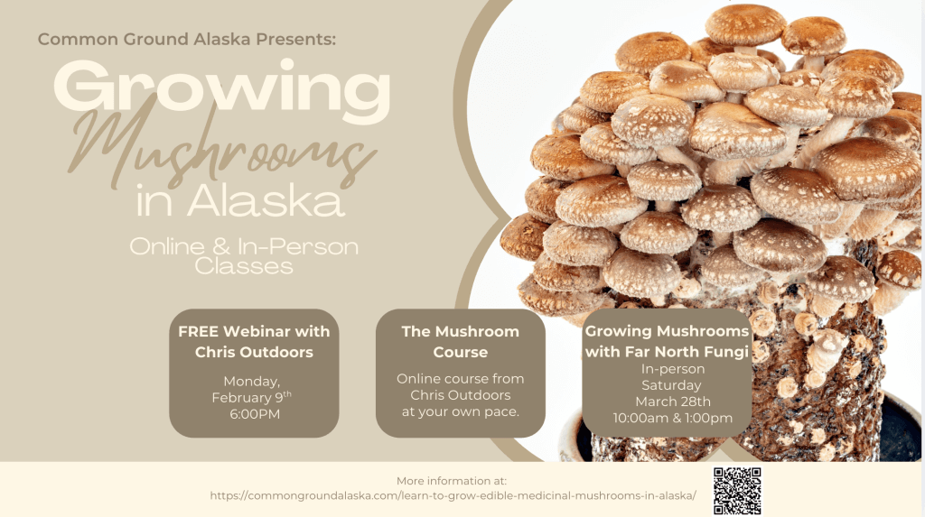 IN-PERSON, HANDS-ON CLASSES: In our usual style, we had to find a way to offer in-person classes where you can make your own mushroom kit to take home! The folks from Far North Fungi are the best and they’ve agreed to teach you how you can grow your very own mushrooms – right at home! You’ll be harvesting mushrooms about three weeks after the class! What a cool way to increase sustainability on your own homestead! Both in-person, make-and-take classes are being held on Saturday, March 28 in the Cafe at Susitna Brewing in Big Lake. Space is limited so don’t delay in getting your tickets. There is a 10 am class and a 1 pm class. You can purchase your tickets here.