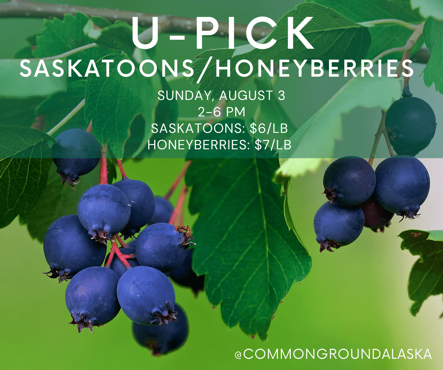 Coming up this week: Honeyberries and Saskatoon berries! We’re opening for 20 spots for Sunday, August 3 from 2-6 pm. The $10 reserves a picking appointment for you and is non-refundable. However, you will be credited the $10 when you check out as long as you come the day you have reserved. We are opening rain or shine. There’s no “getting rained out” – we’re Alaskans!