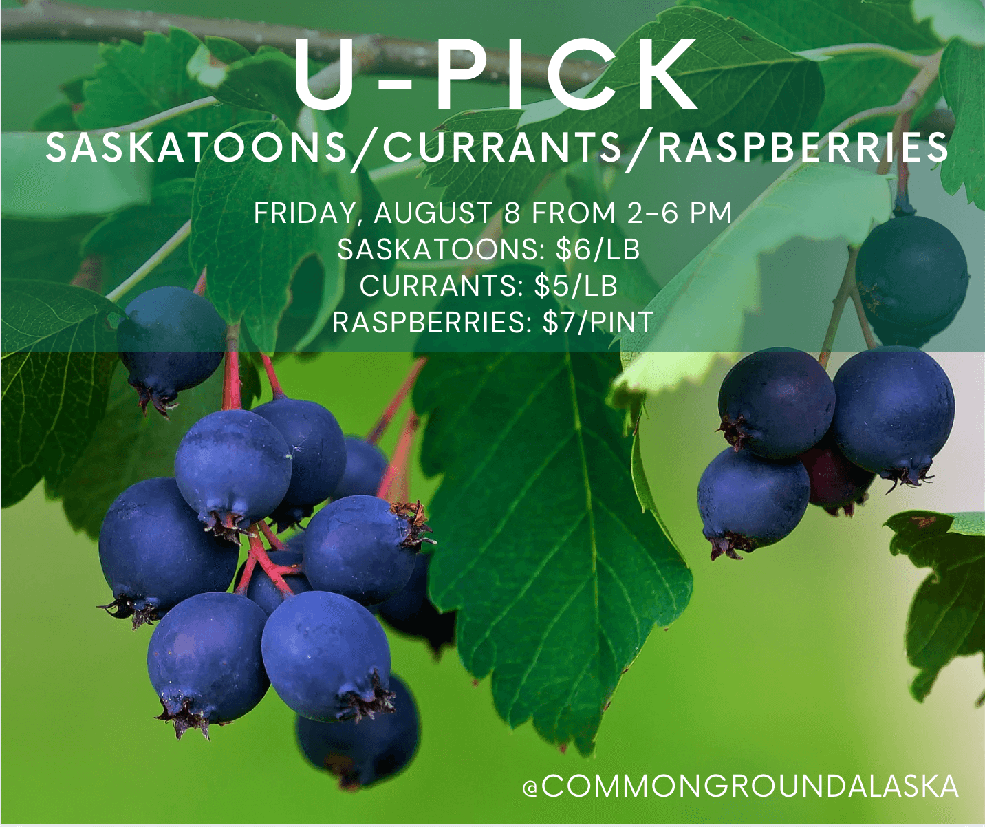 Coming up this week: Everything on the farm is starting to ripen – it’s such a fun time of year! Friday, August 8 we will have Saskatoons, Red & Black Currants, and limited Red & Golden Raspberries. We’re opening for 25 spots for Friday, August 8 from 2-6 pm. The $10 reserves a picking appointment for you and is non-refundable. However, you will be credited the $10 when you check out as long as you come the day you have reserved. We are opening rain or shine. There’s no “getting rained out” – we’re Alaskans!
